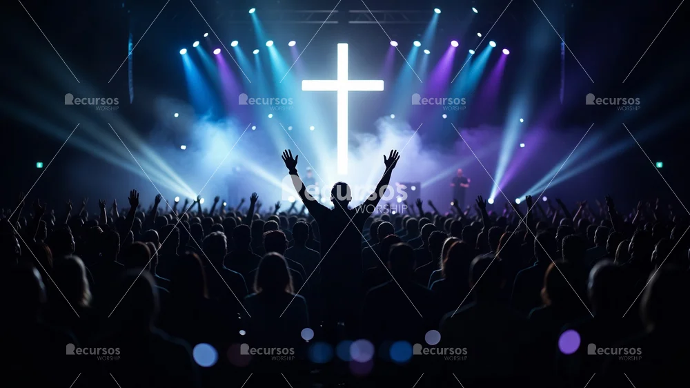 Eleva tu impacto visual con esta potente imagen de adoración cristiana con silueta y cruz iluminada sobre un escenario moderno. Este recurso UHD es perfecto para fondos de canciones, anuncios de eventos en redes sociales y presentaciones en vivo que buscan transmitir fervor espiritual.