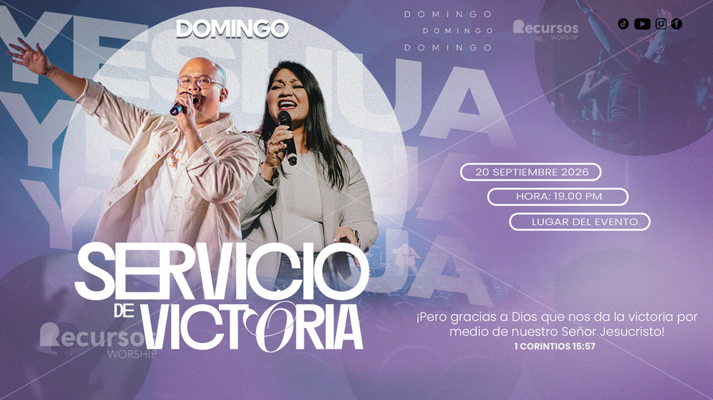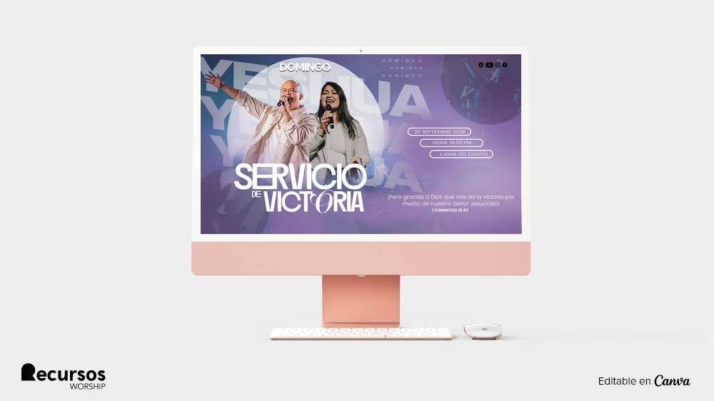 Esta plantilla de adoración con degradado morado para eventos plantilla horizontal para proyector fue diseñada para captar la atención. Con textos grandes y espacios para fotos, es ideal para anuncios. Transforma tus servicios de culto en mensajes visuales que impacten a tu congregación.