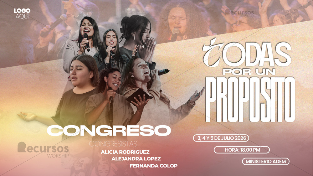 Cree una atmósfera única con esta plantilla de banner para evento de adoración moderna y congresos religiosos plantilla horizontal para proyector. Diseño profesional y cálido, optimizado para pantallas panorámicas en congresos, facilitando la comunicación visual de su iglesia.