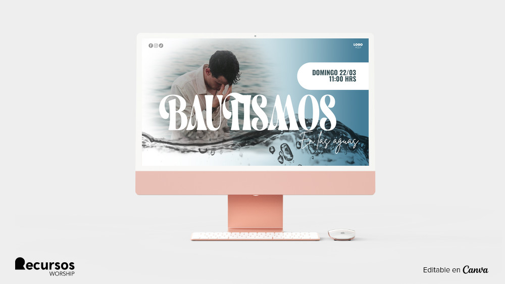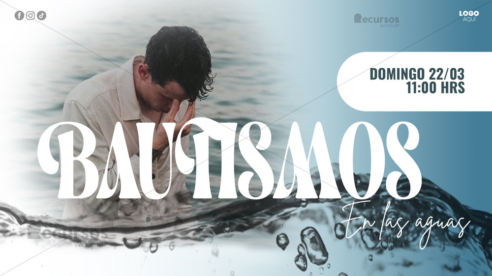 Mejore sus proyecciones con esta plantilla de evento moderno de bautismo en agua para iglesia editable profesional plantilla horizontal para proyector. Logre una comunicación visual clara en el templo con un diseño profesional optimizado para pantallas panorámicas de alta calidad.