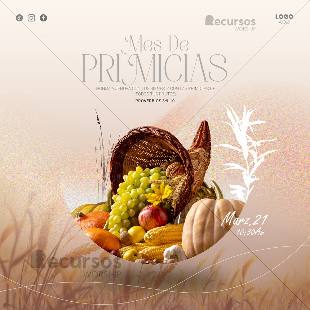Descubre esta hermosa Plantilla de Primicias, abundancia de cosechas editable para iglesia plantilla cuadrada para redes. Diseñada con una cornucopia para transmitir calidez, esta gráfica de alta calidad resalta elementos de la cosecha. Perfecta para redes y servicios de ofrenda.