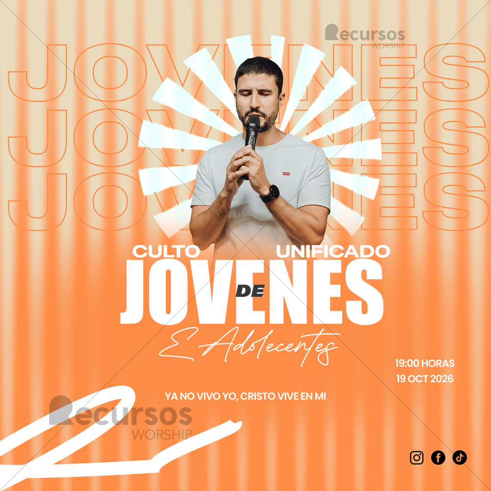 Optimiza tu promoción con esta plantilla de publicación en redes sociales de evento juvenil naranja plantilla cuadrada para redes. Su vibrante diseño en tonos naranja atraerá a los jóvenes. Contiene espacios para fotos y textos, asegurando que tu culto juvenil siempre destaque.