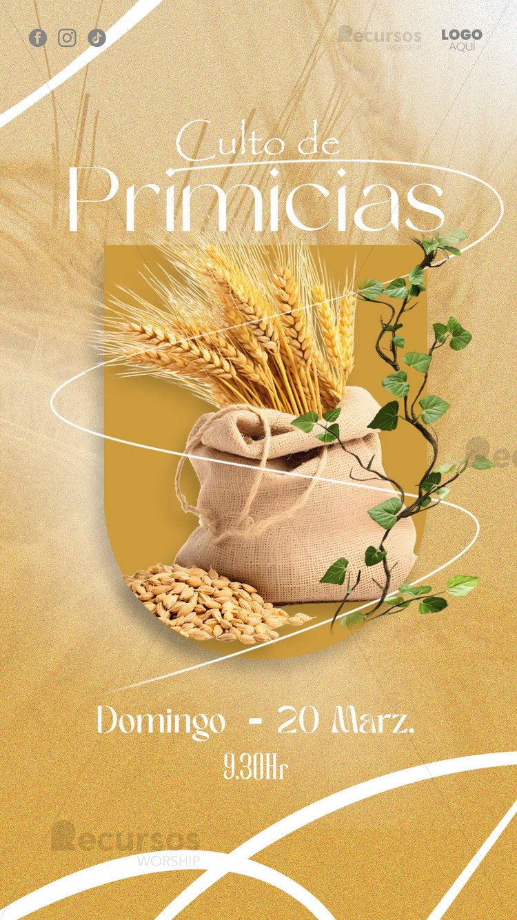 Diseño moderno y acogedor, ideal para el ‘Culto de Primicias’ en tu iglesia. Esta Plantilla editable de diseño profesional para eventos de primicias y cosechas plantilla vertical para stories es completamente editable y resalta los elementos de la cosecha en llamativos tonos dorados.