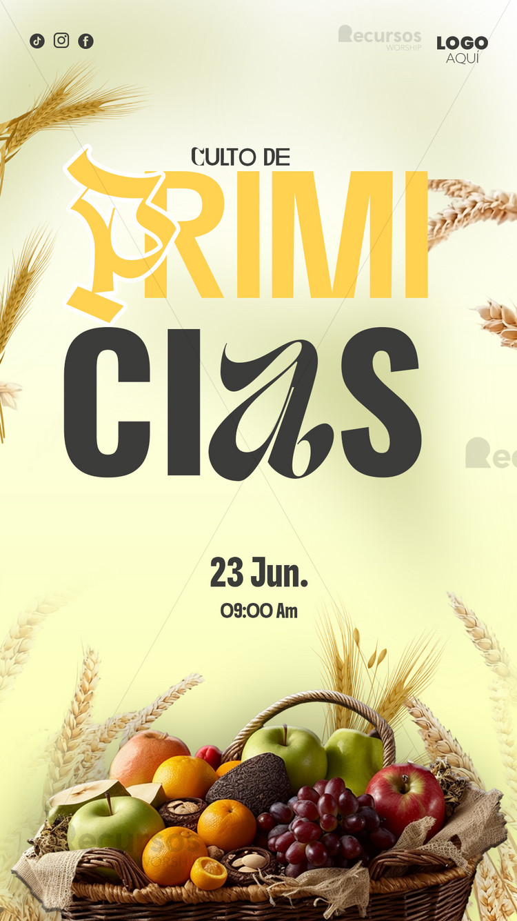 Mejora tus anuncios con esta plantilla moderna de culto a los primeros frutos editable plantilla vertical para stories. Diseño cálido para iglesias que buscan creatividad. Con espacios para logos y redes, es perfecta para fomentar el agradecimiento en servicios y eventos especiales.