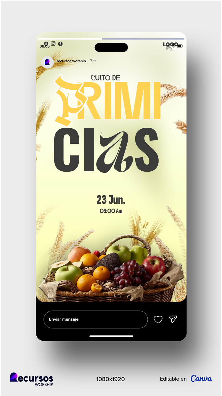 ¿Te falta tiempo para crear contenido visual atractivo en tus historias? Esta plantilla profesional te ayuda a captar la atención de tu congregación sin conocimientos de diseño. Incluye diseño en alta resolución para dispositivos móviles. Compatible con Canva. Capas organizadas para edición rápida de textos, colores y elementos. Ahorra horas de trabajo creativo. Cualquier miembro de tu ministerio puede personalizarla fácilmente. Resultado profesional garantizado con esta plantilla moderna de culto a los primeros frutos editable plantilla vertical para stories. Descarga inmediata tras la compra. Soporte incluido. ¡Eleva la imagen de tu iglesia hoy!