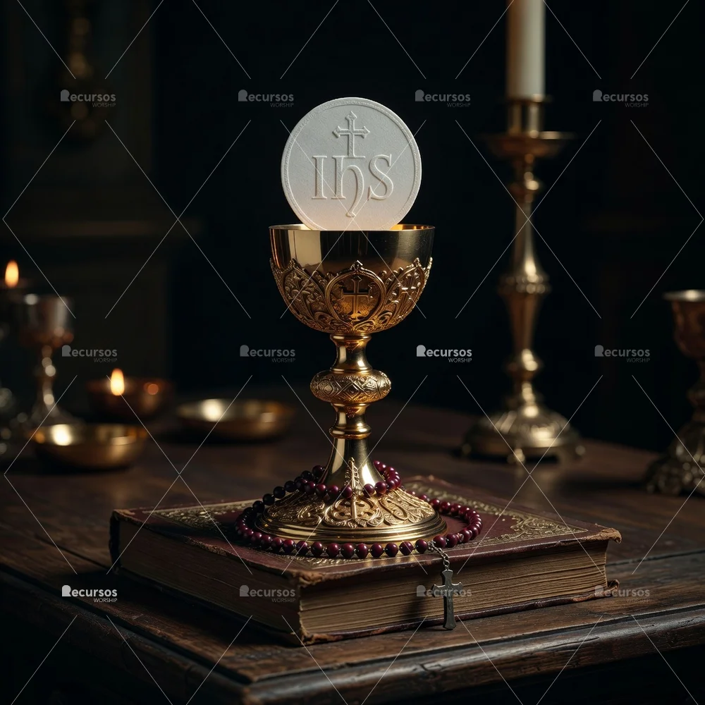 Mejora el impacto de tus servicios con esta impactante imagen de Santa Cena con cáliz de oro y hostia sobre una biblia. Un recurso visual de alta resolución perfecto para fondos de adoración, diapositivas de sermones, redes sociales y materiales digitales de tu ministerio hoy.