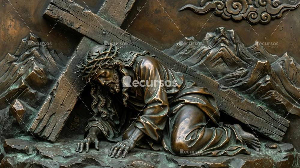 Impactante imagen de Semana Santa de Jesús con la cruz, ideal para enriquecer la comunicación visual de tu ministerio. Este recurso de alta calidad es perfecto para presentaciones, fondos de sermón y redes sociales, ofreciendo un estilo artístico sacro de gran profundidad.